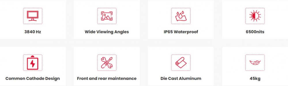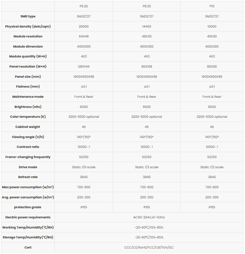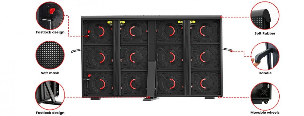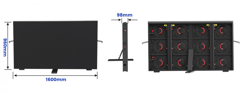 Full die-casting Aluminum module and cabinet frame not only accelerate heat dissipation;also own light weight 45KG;Cabinet size 960x1600x96mm