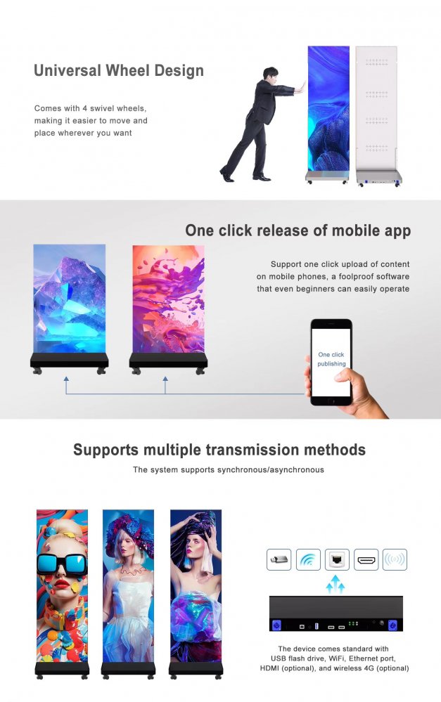 Smart WiFi 4G USB Movable Advertising Indoor LED HD LED Poster Display Screen easy operation . it can use phone , computer , USB operation .